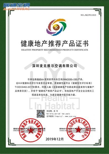 2019年12月,经HiH健康标识评价专家委员会审查,麦克维尔A+变频户式水机的健康性能符合《健康住宅评价标准》T/CECS462-2017的要求,同意入编《全国健康地产创新成果实践案例与健康产品推荐目录》,并授予“健康地产推荐产品证书”;供我国地产开发企业及相关工程建造单位优选,为建设健康中国贡献力量。