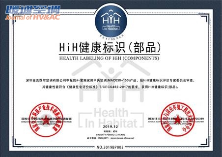 麦克维尔A+变频家用中央空调获“HIH健康”部品证书