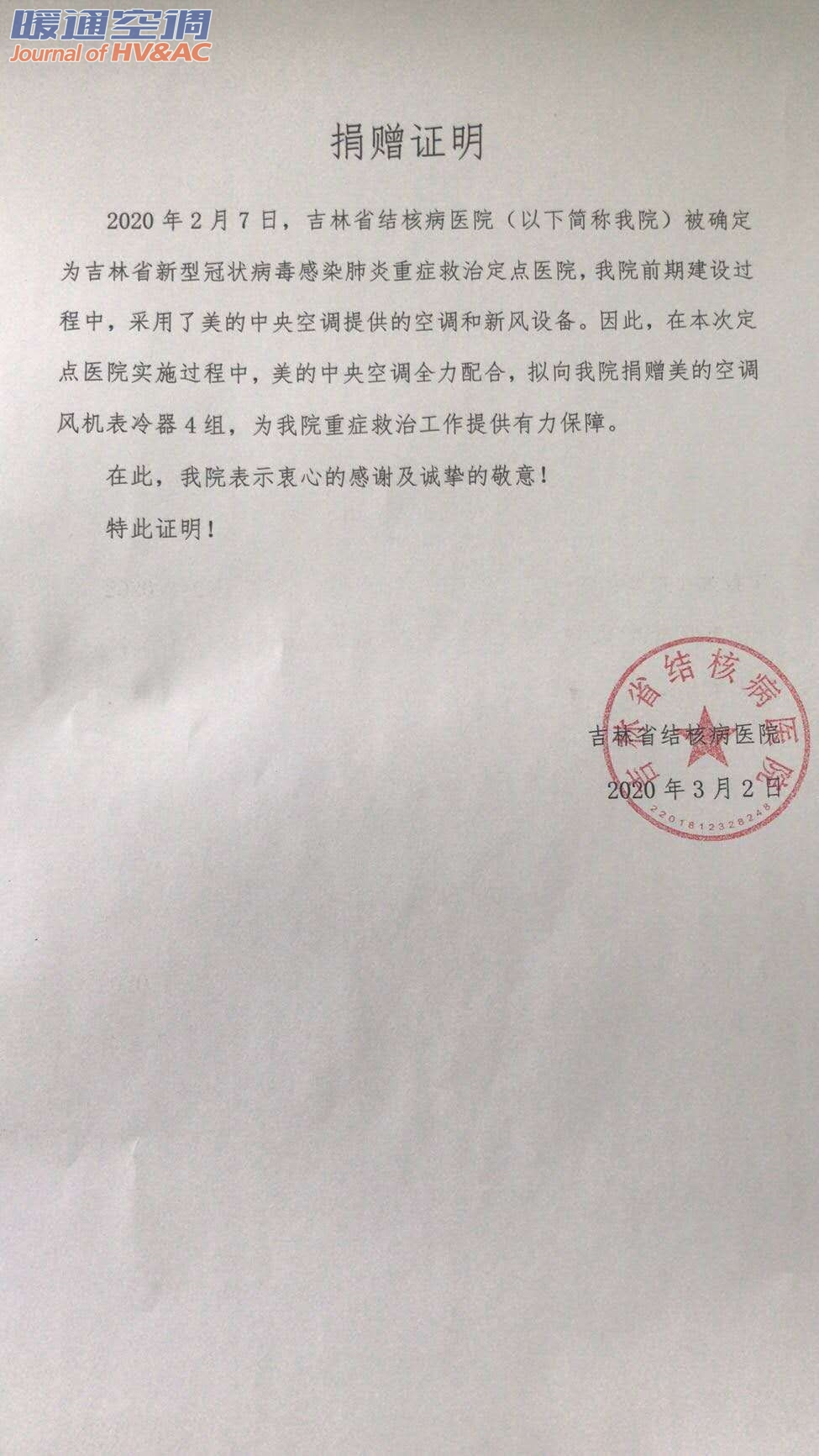 3月2日,美的中央空调收到作为吉林省新型冠状病毒感染肺炎重症救治定点医院的吉林省结核病医院的感谢信。信中称,美的中央空调捐赠的风机表冷器4组,为吉林省结核病医院的重症救治工作提供了有力保障!