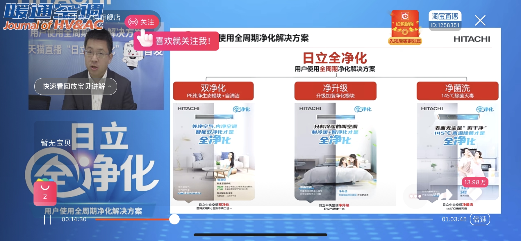 日立中央空调市场推广部总经理李云峰在直播间对日立“全净化”——用户使用周期净化解决方案做了详细解读。他表示,日立中央空调致力追求产品的科技、智慧升级,本次推出的全周期净化解决方案,囊括从产品选购、功能升级到使用保养的全面净化,旨在呵护日立新老用户的美好生活。