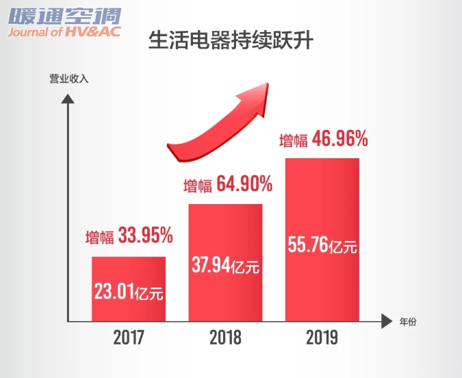 在格力电器《2019年年度报告》中,空调和生活电器的占比变化同样引人瞩目,前者从2018年的78.58%降至69.98%,后者则从1.91%增长到了2.81%。换言之,格力生活电器发展迅速,2019年实现了46.96%的增长。而参考格力电器近三年的年度报表可见,生活电器在2017年增长33.95%,2018年增长64.9%,2019年增长46.96%,近三年来连续高增长,平均连续增幅接近50%。