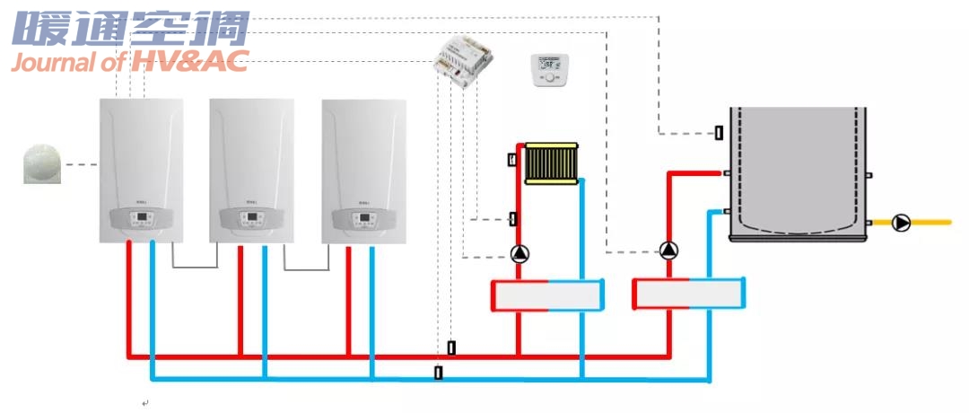 系统选用8台模块式壁挂冷凝炉LUNA DUO-TEC MP1.70保证总供热能力560kW。8台炉互为备用,供热保证率极高。