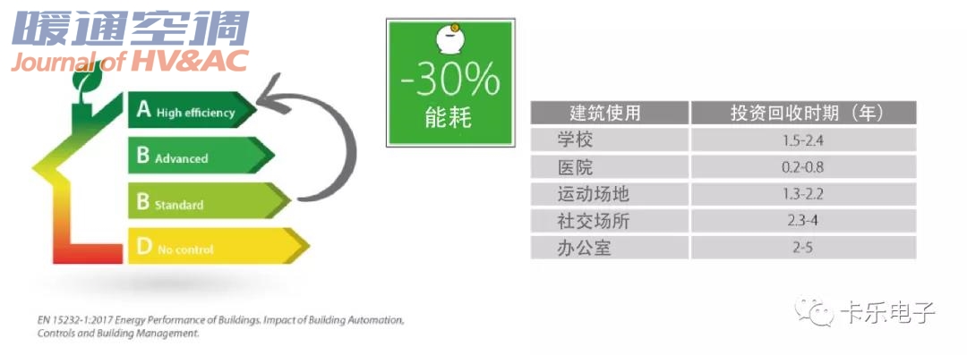 根据欧洲脱碳倡议组织(DECARB EUROPE Initiative,www.decarbeurope.org)的一项研究,在欧洲,采用适当的系统对现有建筑物实施自动化、控制和监控,可以将能耗降低22%-30%,投资范围涵盖12欧元/平米的住宅建筑至30欧元/平米的第三产业,在任何情况下,投资回报率最长只有5年。因此,这是一个低成本的解决方案,易于实施且有重大效益。