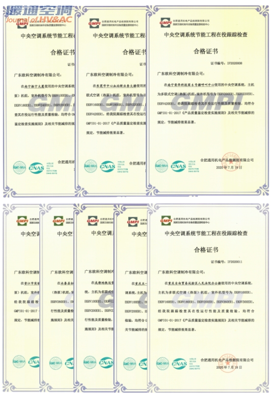 中央空调系统节能工程在役跟踪检查合格证书是由权威第三方机构对客户在用的项目,进行现场测试,测试项目有噪音、风速、房间温度分布等,每一项测试结果都有严苛的要求,所有项目都达标,才能颁发证书。此次东莞市中心血站新业务大楼、南宁荣华科技园6号楼呼叫中心、南宁振宁大厦、福建晋江实验小学、福州永泰妇幼保健院等8个项目荣获合格证书,再次证明EK全变频多联机稳定、高效和舒适的特点。