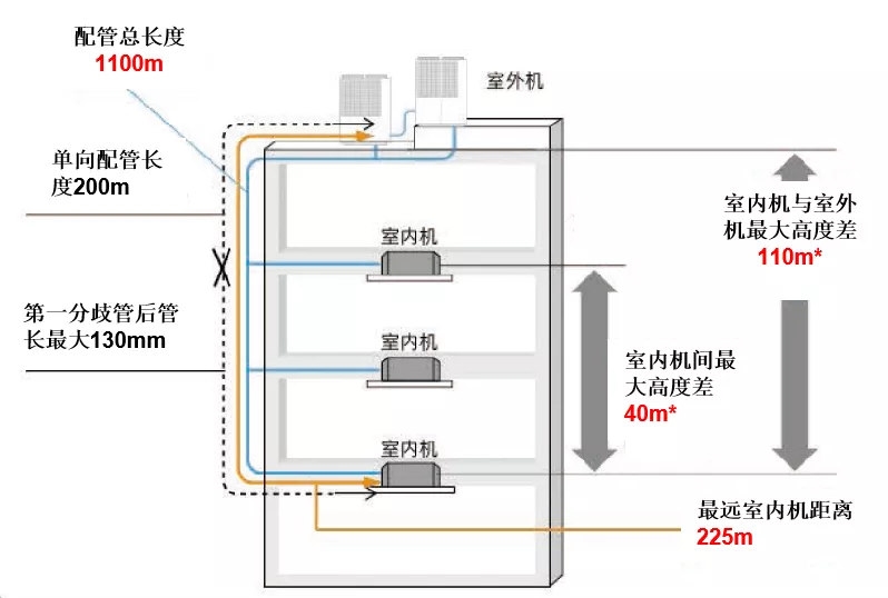 TXZ系列智能楼宇空调采用长配管设计,配管总长超过1100M,室内外机最大高度落差提升至110M,安装更加自由便利。