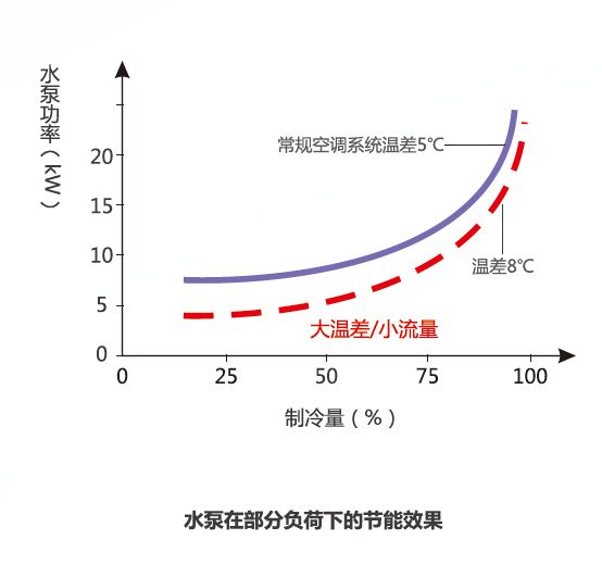 8℃大温差设计冷水量。水管直径、水泵容量减小,可降低初投资和运行费用。