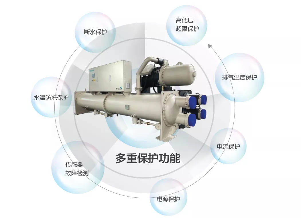 此外,机组拥有水温防冻保护、断水保护、高压保护、低压保护、过电流保护、电源保护、排气温度保护、传感器故障检测等保护控制,确保机组在复杂的运行环境中安全运行,保持良好状态。